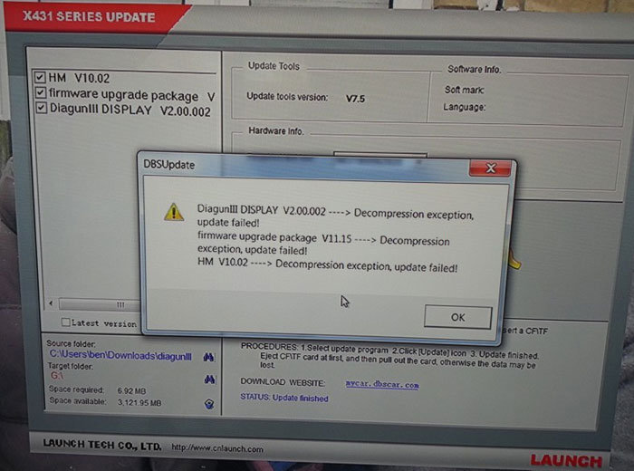 Lorsque vous mettez à jour le lancement x431 iii , il vous invite à jour fichier a échoué , tout comme cette photo :
